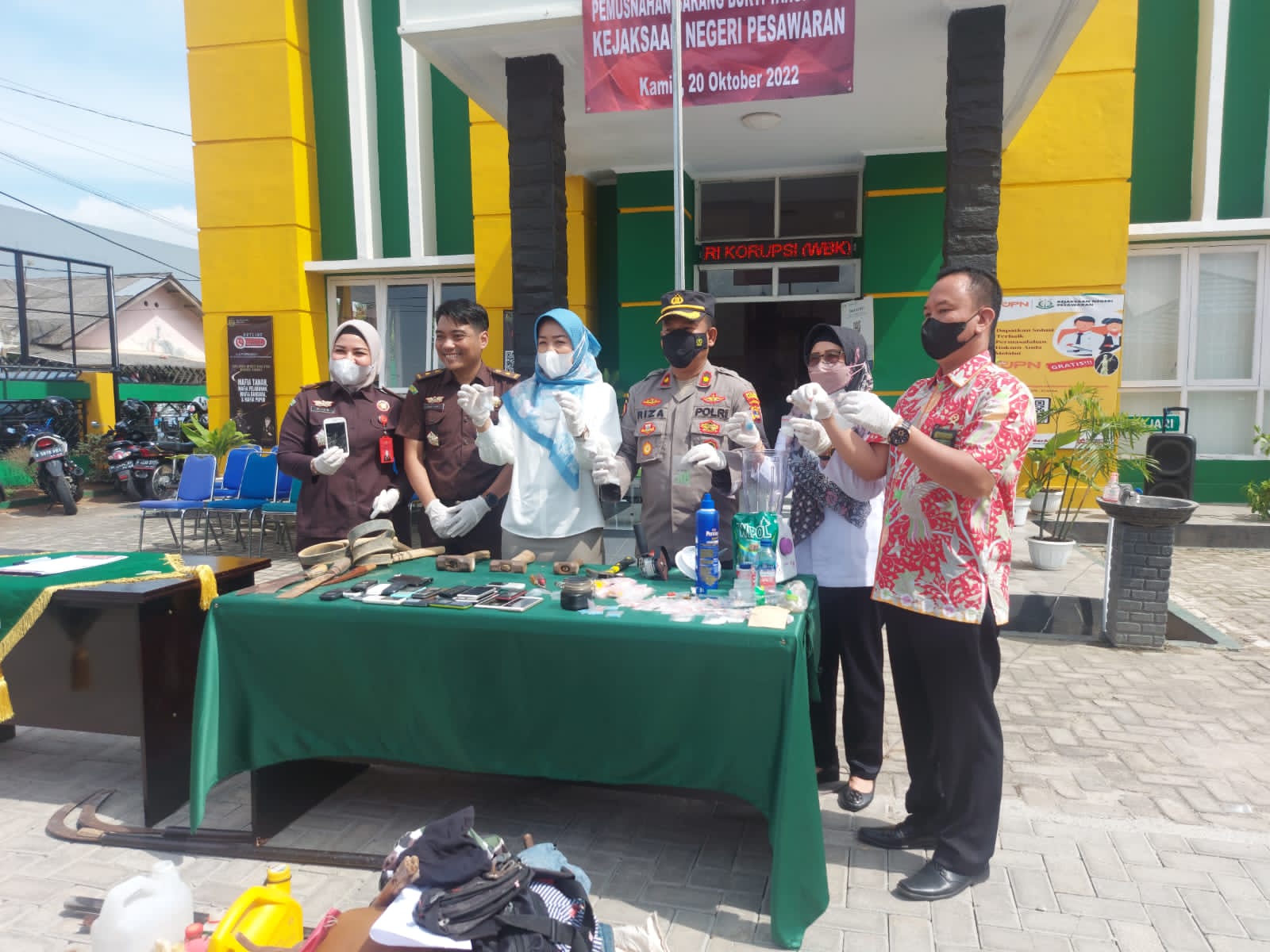 Pesawaran (HO) – Kejaksaan Negeri (Kejari) Kabupaten Pesawaran bersama instansi terkait melakukan pemusnahan barang bukti tindak pidana narkotika dan tindak pidana umum lainnya yang telah berkekuatan hukum tetap.