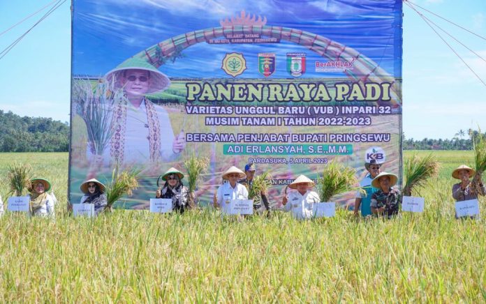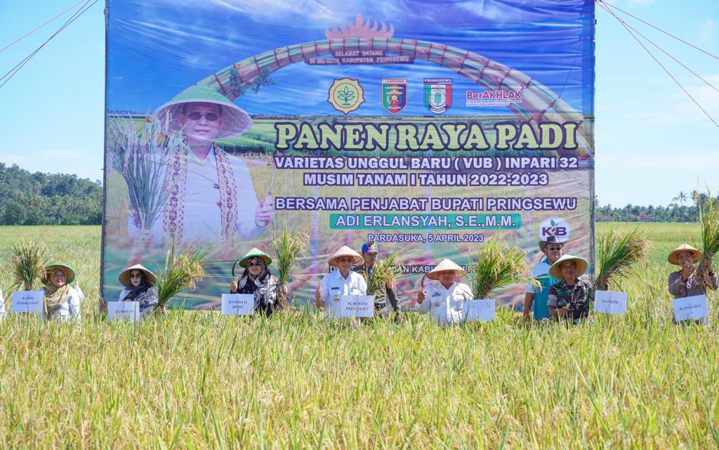 Hal tersebut disampaikan Penjabat (Pj.) Bupati Pringsewu Adi Erlansyah saat menghadiri Panen Raya Padi Varietas Unggul Baru (VUB) Inpari 32 Kelompok Tani Gemah Ripah di Pekon Sukorejo, Kecamatan Pardasuka, Kabupaten Pringsewu, Rabu (05/04/23).