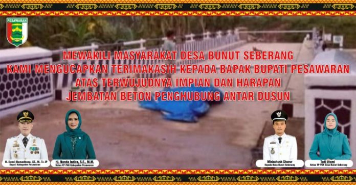 Pesawaran (HO) – Ratusan Masyarakat Desa Bunut Seberang Kecamatan Way Ratai Kabupaten Pesawaran Provinsi Lampung mengucapkan ribuan terima kasih kepada Bupati Pesawaran H.Dendi Ramadhona atas telah dibangun nya Jalan Penghubung antar dusun di desanya.