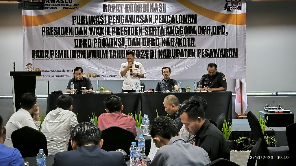 Pesawaran (RN) – Badan Pengawas Pemilihan Umum (Bawaslu) Kabupaten Pesawaran, mengelar rapat koordinasi publikasi pengawasan pencalonan presiden dan wakil presiden, serta anggota DPR, DPD, DPRD Provinsi dan DPRD Kabupaten/Kota Pada Pemilihan Umum Tahun 2024. Yang digelar di Hotel Kyriad M2 Bandar Lampung Sukadana Ham, Kecamatan Tanjung Karang Barat, Bandar Lampung, Senin (23/10/2023).