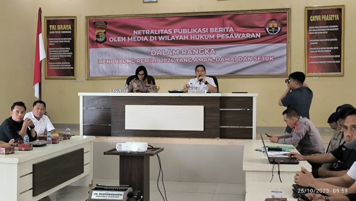 Pesawaran (RN) – Mendukung pemilu 2024 yang aman damai dan sejuk, Kapolres Pesawaran mengelar diskusi dengan kepala dinas Kominfo dan pers, dengan tema Netralitas Publikasi Berita Oleh Media di Wilayah Kabupaten Pesawaran.