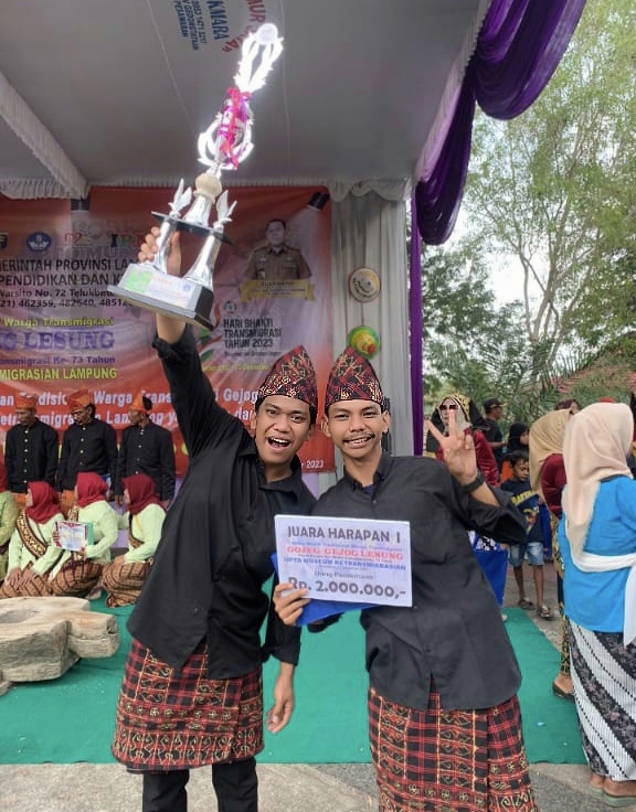 Pesawaran (RN) – Kelompok Gojeg Lesung KRB Dusun Bangun Sari Desa Bagelen Kecamatan Gedong Tataan Kabupaten Pesawaran meraih juara Harapan I dalam Festival Lomba kesenian tradisional warga Transmigrasi, yang digelar Dinas Pendidikan dan Kebudayaan Provinsi Lampung di Museum Transmigrasi, Kamis (21/12/2023).