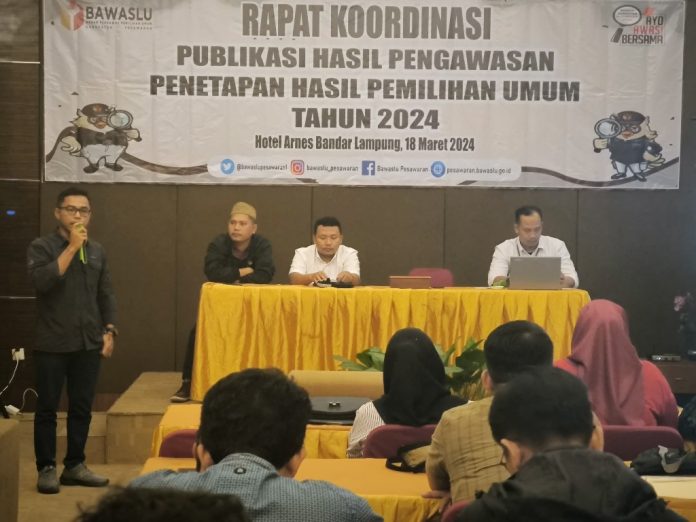 Pesawaran (RN)- Badan Pengawas Pemilu (Bawaslu) Kabupaten Pesawaran menggelar Rapat Kordinasi Publikasi hasil Pengawasan Penetapan Hasil Pemilu Umum 2024. Bersama Parpol dan Panwascam di Hotel Arnes Bandar Lampung, Senin (18/03/2024).