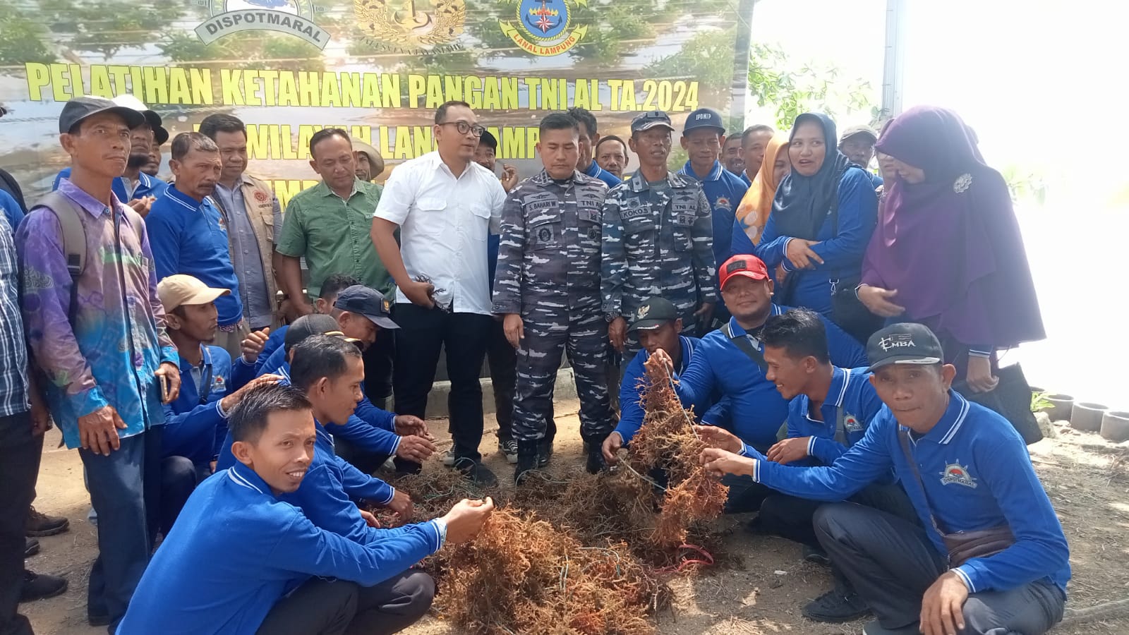 Lampung (RN)- Tentara Nasional Indonesia (TNI) Angkatan Laut (AL) memberikan pelatihan ketahanan pangan mengenai budidaya rumput laut, Udang Vaname menggunakan Bioflok, jagung dan padi dibawah binaan Pangkalan TNI Angkatan Laut (Lanal) Lampung.