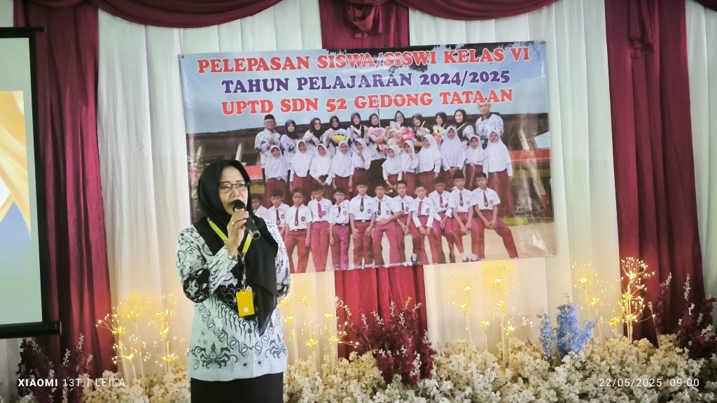 Pesawaran (RN) – Unit Pelaksana Teknis Daerah (UPTD) Sekolah Dasar Negeri (SDN) 52 Gedong Tataan menggelar acara perpisahan dan pelepasan siswa-siswi kelas 6 tahun pelajaran 2024/2025 di Aula sekolah, Desa Sungai Langka Kecamatan Gedong Tataan Kabupaten Pesawaran, Kamis (22/05/2025).