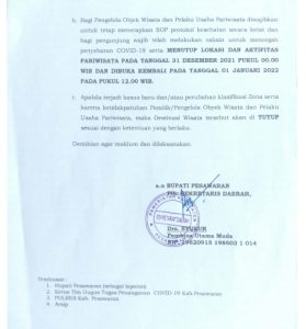 “Ya dalam rangka menghadapi libur natal dan tahun baru, sekaligus mengantisipasi adanya cluster penyebaran Covid-19, dengan ini kami akan menutup lokasi dan aktifitas pariwisata pada tanggal 31 Desember 2021 pukul 00.00 WIB hingga tanggal 1 Januari 2022 pukul 12.00 WIB, atau selama 36 jam,” ungkap Ketut, Minggu (26/122021).