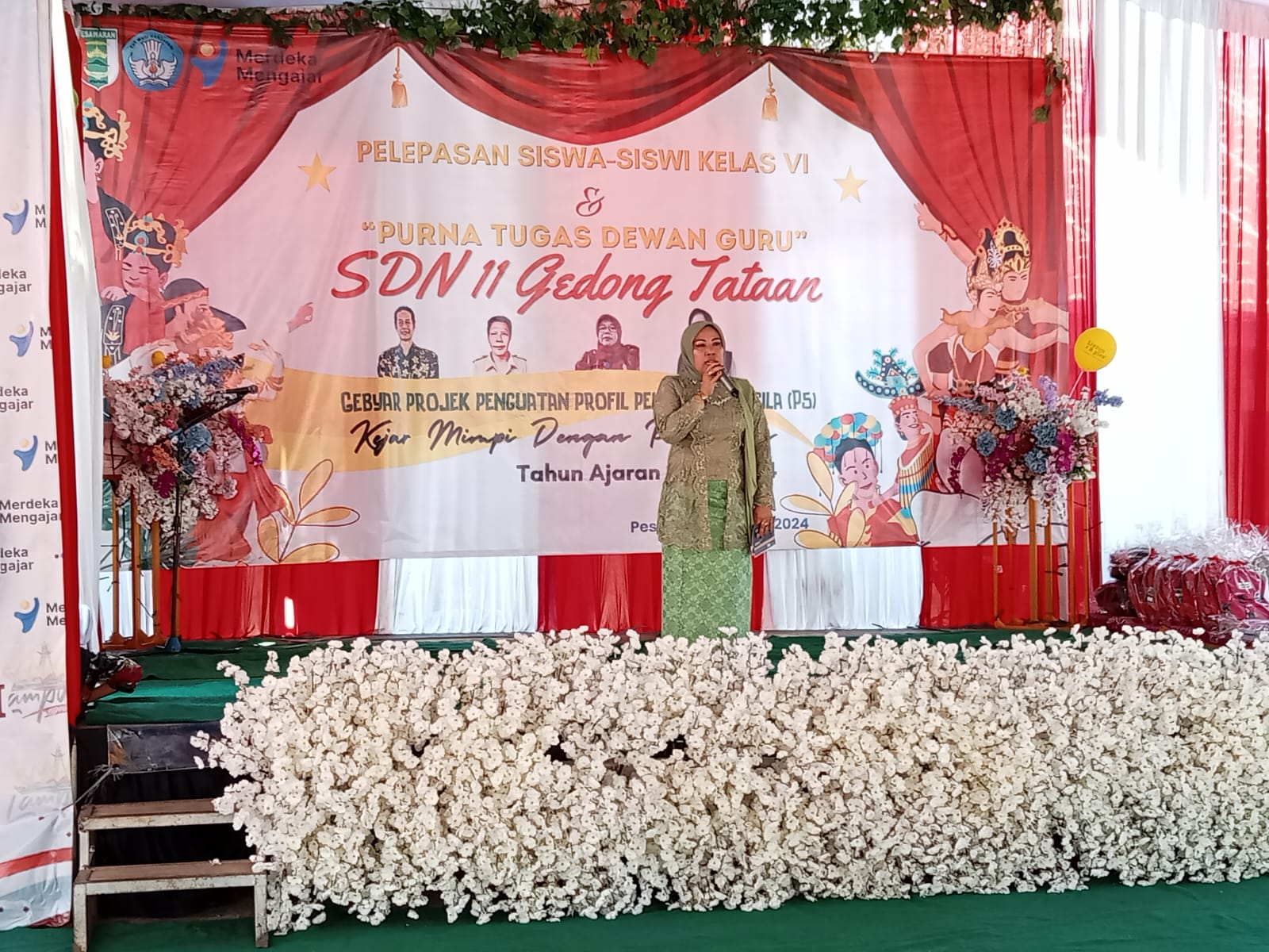 Pesawaran (RN) -UPTD Sekolah Dasar (SD) Negeri 11 Gedong Tataan Kabupaten Pesawaran Gebyar Projek Penguatan Profil Pancasila dan purna tugas dewan guru. Kegiatan di gelar halaman sekolah setempat Desa Sukabanjar Kecamatan Gedong Tataan Kabupaten Pesawaran. Dengan Tema, Kejar Mimpi Dengan Perubahan,.Kepala UPTD SDN 11 Gedong Tataan Leny Marlina, M.pd, mengatakan kegiatan hari ini, ada berapa kegiatan, gebyar penguatan profil Pancasila (P5), purna tugas dewan guru dan pelepasan siswa siswi kelas enam.“Hari ini SDN 11 melepas 42 siswa-siswi. Semoga dengan lulusnya Siswa siswi dapat menjadi bekal untuk melangkah jenjang pendidikan yang lebih tinggi lagi,” kata Leny Marlina, M.pd. Kamis (06/06/2024).Kepala Sekolah SDN 11 Gedong Tataan Leny Marlina,. Mpd“Saya ucapkan para orang tua yang telah menitipkan anak nya di SDN 11 Gedong Tataan, Perjalanan anak-anak selama 6 tahun ini, sungguh sangat banyak perubahan dari baca tulis, berhitung, sampai perlahan mulai mampu mengelola sikap dan emosi,” Kata Leny Marlina, S.pd., MM. Kamis (06/06/2024).Dirinya juga mengatakan, Perubahan Siswa siswi ini sejatinya patut kita syukuri, semua tidak lain berkat peran guru di Sekolah dan orang tua yang senantiasa bersama-sama mendidik, mendampingi, serta mendukung cita-cita anak-anak sebagai penerus bangsa ini.“Alhamdulilah, kegiatan ini berjalan dengan lancar, berkat bantuan semua pihak dan dukungan dari seluruh wali murid,” ujarnya.Sementara itu Kepala Desa Suka Banjar Kecamatan Gedong Tataan Kabupaten Pesawaran Sunarno, mengatakan Sekolah SDN 11 sangat membantu warga khususnya warga suka Banjar, seperti yang dilakukan kepala sekolah dan dewan guru, melalui Jum’at berkah dengan membagikan paket sembako kepada warga di lingkungan sekolah.“Hari ini adalah momen perpisahan sekolah yang sangat berarti, kita berkumpul dengan perasaan haru dan bangga, dimana para dewan guru melepas para siswa yang telah menyelesaikan perjalanan mereka di sekolah ini. Sekolah adalah sebuah institusi yang memberikan banyak pengalaman dan kenangan yang berharga bagi seluruh siswa-siswa,”ucapnya.Ditempat yang sama Kepala dinas Pendidikan dan Kebudayaan Kabupaten Pesawaran Anca Martha Utama yang di wakili Sekertaris Herawati, SE,. M.M, Mengatakan, apresiasi setinggi tingginya kepada kepala sekolah dan dewan guru SDN 11 Gedong Tataan yang mana acara ini sangat luar biasa.“Selamat buat siswa siswi yang telah lulus dan menyelesaikan pembelajaran di sekolah SDN 11 ini, semoga ilmu yang di dapatkan menjadi bekal untuk meneruskan kejenjang selanjutnya. Semoga SDN 11 Gedong Tataan dapat berkembang dan meningkatkan lagi prestasi anak anak dalam bidang seni maupun pendidikan,”ujarnya. (zal)